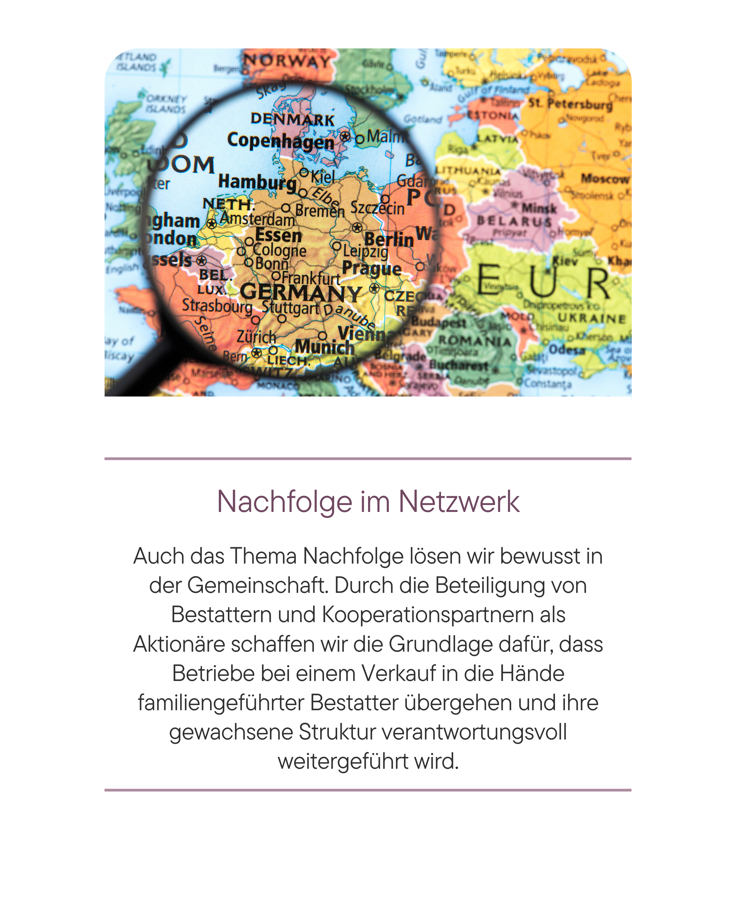 Unsere lokalen Bestattungsunternehmen behalten all das, was sie ausmacht – ihre Individualität, ihren Namen, ihre Außenwahrnehmung und ihre tiefen lokalen Wurzeln. Gemeinsam mit Ihnen und Ihrem Team werden wir in einem offenen, ehrlichen und transparenten Dialog erarbeiten, wie und wann wir die Stärken unserer Gruppe am besten bei Ihnen vor Ort einbringen können.